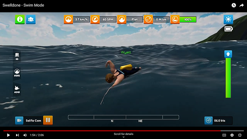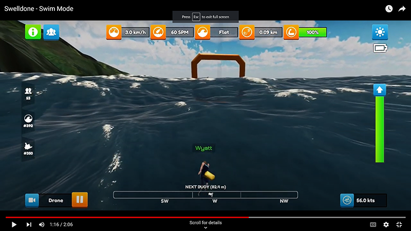 The Virtual fun never ends! SwellDone application platform is integrated with Virtual Swimming from your From your SwimFast ergometer - your performance is integrated to the virtual courses, you become the swimmer! Viewable in Drone, 3rd person, First person selectable modes.